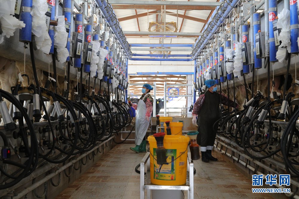 小黑山奶牛養(yǎng)殖專(zhuān)業(yè)合作社的工人在擠奶臺(tái)上擠奶。新華網(wǎng)發(fā)(白敖敏 攝)