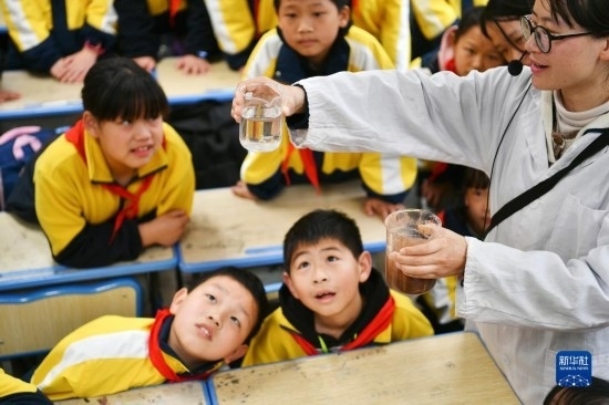 3月22日,在四川省廣安市前鋒區(qū)前鋒小學(xué),老師在向?qū)W生展示過濾前后的水質(zhì)變化。