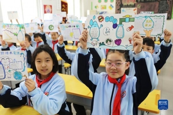 3月22日,河南省平頂山市寶豐縣山河路小學(xué)學(xué)生展示自己制作的節(jié)水護水畫報。