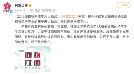 ·贛州于都縣一幼兒園招收初三學生為見習生,園長被約談。