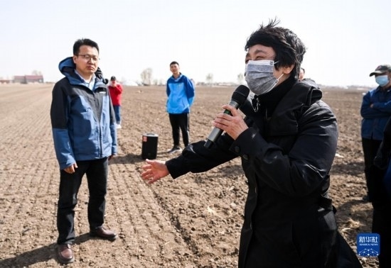 4月17日,在通遼市科爾沁左翼中旗腰林毛都鎮(zhèn),科爾沁左翼中旗農(nóng)技推廣中心主任梅園雪向種植戶推廣介紹密植滴灌高產(chǎn)技術(shù)。