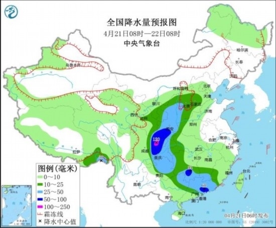 4月21日08時至22日08時,新疆沿天山高海拔地區(qū)和南疆南部、西藏北部和東部、青海東部、甘肅中南部、寧夏、陜西北部、山西中北部等地部分地區(qū)有小到中雪或雨夾雪,其中甘肅南部、山西西部局地有大到暴雪(10~18毫米);西北地區(qū)東南部、華北中南部、西南地區(qū)東部、江漢西部、江南中南部、華南北部和東部等地部分地區(qū)有中到大雨,其中,四川盆地東部、重慶西部、湖南南部、廣東東部等地部分地區(qū)有暴雨或大暴雨(100~120毫米)。內(nèi)蒙古東北部、黑龍江東北部、浙江北部等地部分地區(qū)有4~6級風(fēng)。渤海海域、黃海海域、東海北部、臺灣海峽將有6~7級風(fēng),陣風(fēng)8~9級。