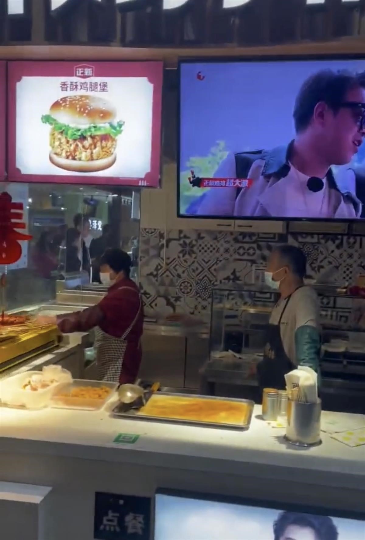 視頻中店內(nèi)宣傳廣告圖顯示,香酥雞腿堡除了兩片面包外,中間夾有蔬菜和雞肉,與顧客購買到手的漢堡相差甚遠。