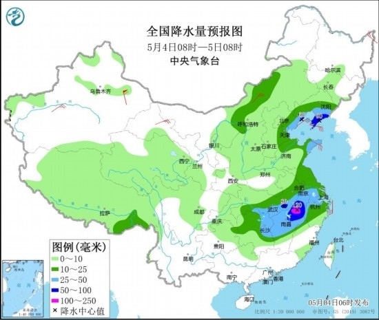 5月4日08時至5日08時,湖北南部和東部、安徽南部、湖南東北部、江西中北部、浙江西部、江蘇南部以及山東半島、遼寧南部、河北東部等地部分地區(qū)有大到暴雨,其中,安徽南部、江西北部等地部分地區(qū)有大暴雨(100~120毫米)。上述部分地區(qū)伴有短時強降水(最大小時降雨量20~40毫米,局地可超過50毫米),局地有雷暴大風等強對流天氣。內(nèi)蒙古中部、黑龍江東北部、新疆南疆盆地、甘肅河西、山東半島等地部分地區(qū)有4~6級風,其中,新疆東部部分地區(qū)有8~9級風。渤海、渤海海峽、黃海大部、東海北部海域?qū)⒂?~8級、陣風9~10級的大風。