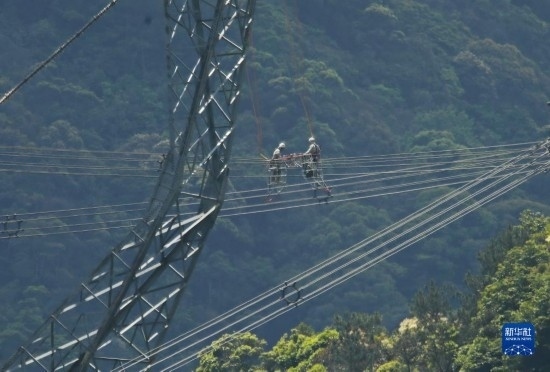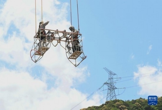 5月4日,在福建省寧德市洪口鄉(xiāng),國網(wǎng)福建超高壓公司帶電班檢修工周曉剛(右)對輸電線路進(jìn)行帶電作業(yè)。