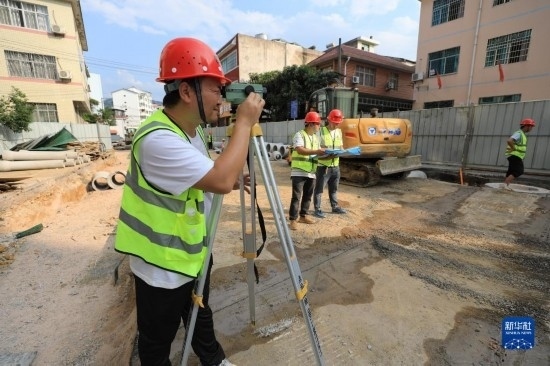 5月4日,青年工人在貴州省銅仁市江口縣雙江街道雙月社區(qū)城市供排水提升工程施工現(xiàn)場工作。