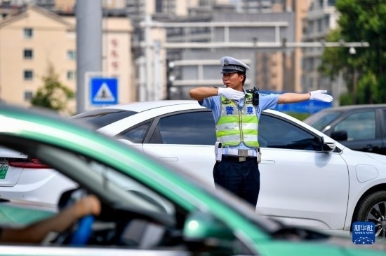 5月4日,交警在貴州省遵義市紅花崗區(qū)海爾大道指揮交通。