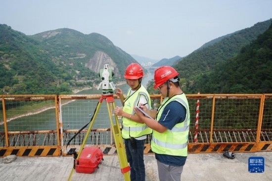 5月4日,在重慶市北碚區(qū)渝武高速復(fù)線觀音峽嘉陵江特大橋,中交一公局四公司橋梁工區(qū)工作人員孫培耕(左)和彭昭屏在對橋面高程及軸線偏位進(jìn)行測量。