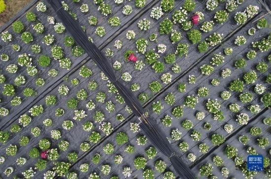 5月5日,在肥西縣經(jīng)開區(qū)一家農(nóng)林科技企業(yè),員工在打理繡球花(無人機(jī)照片)。