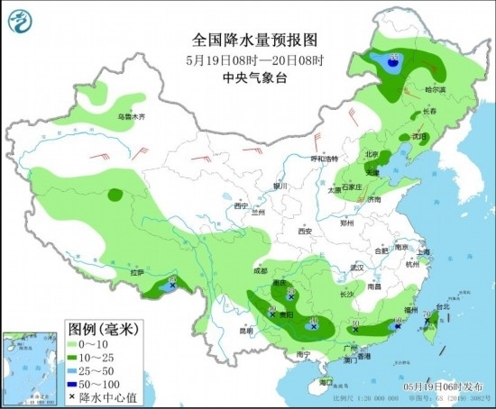 5月19日08時(shí)至20日08時(shí),內(nèi)蒙古東部、東北地區(qū)、華北中東部、新疆北部、西藏、西南地區(qū)東部和北部、江南西部和南部、華南大部等地部分地區(qū)有小到中雨,局地有大雨或暴雨(50~70毫米),上述部分地區(qū)伴有短時(shí)強(qiáng)降水,局地有雷暴大風(fēng)或冰雹等強(qiáng)對(duì)流天氣。內(nèi)蒙古、東北地區(qū)、西北地區(qū)東部等地部分地區(qū)有4~6級(jí)風(fēng)。