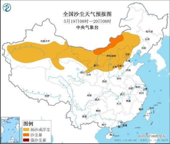 19日至20日,受冷空氣影響,新疆東部和南部、西北地區(qū)東部、內(nèi)蒙古、東北地區(qū)、華北等地將有一次大風(fēng)降溫和沙塵天氣。上述部分地區(qū)氣溫下降4~8℃,局部地區(qū)超過10℃。預(yù)計(jì),5月19日08時(shí)至20日08時(shí),內(nèi)蒙古、東北地區(qū)西部、新疆南部和東部、西北地區(qū)東部、華北北部等地部分地區(qū)有5~7級(jí)、局地8級(jí)以上的大風(fēng),陣風(fēng)風(fēng)力可達(dá)9~11級(jí);5月20日08時(shí)至21日08時(shí),內(nèi)蒙古、東北地區(qū)西部和南部、新疆南部和東部、西北地區(qū)東部、華北北部等地部分地區(qū)有5~6級(jí)、局地7級(jí)以上的大風(fēng),陣風(fēng)風(fēng)力可達(dá)8~10級(jí);5月19日08時(shí)至20日08時(shí),新疆南部和東部、青海西北部、內(nèi)蒙古中西部和東南部、甘肅西部、寧夏中北部、陜西北部、山西中北部、河北中北部、北京、天津等地的部分地區(qū)有揚(yáng)沙或浮塵天氣,其中,內(nèi)蒙古中西部偏北地區(qū)局部有沙塵暴。中央氣象臺(tái)5月19日06時(shí)繼續(xù)發(fā)布大風(fēng)藍(lán)色預(yù)警和沙塵暴藍(lán)色預(yù)警。