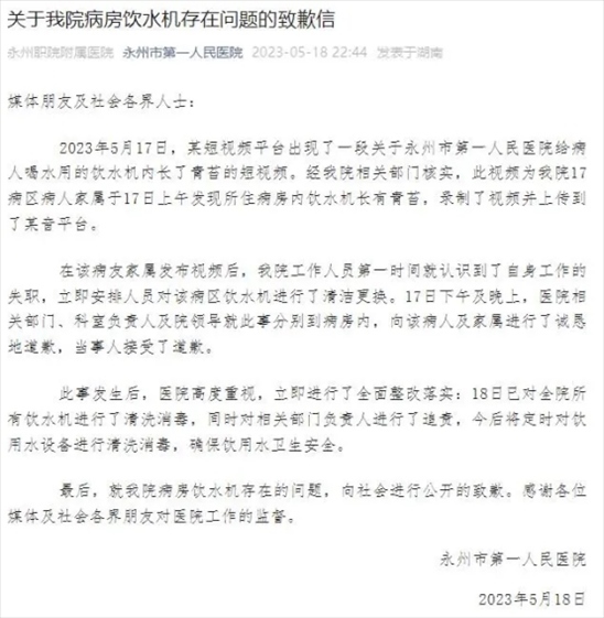 ·永州第一人民醫(yī)院致歉病房飲水機(jī)長(zhǎng)青苔:追責(zé)相關(guān)部門負(fù)責(zé)人。
