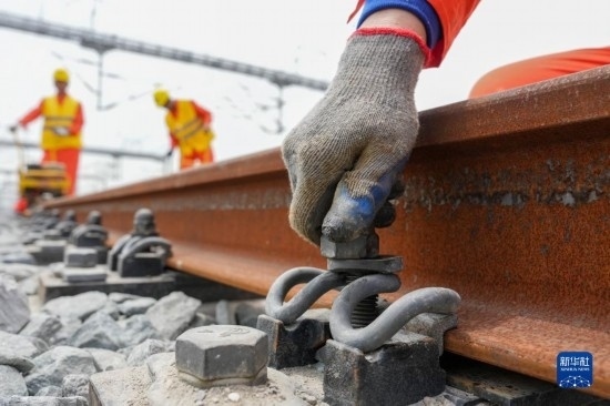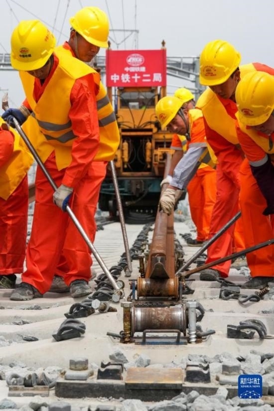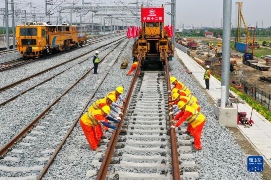 5月20日,在滬寧沿江高鐵太倉站施工現(xiàn)場(chǎng),中鐵十二局的工程人員準(zhǔn)備進(jìn)行螺栓緊固作業(yè),將對(duì)接好的鋼軌固定。