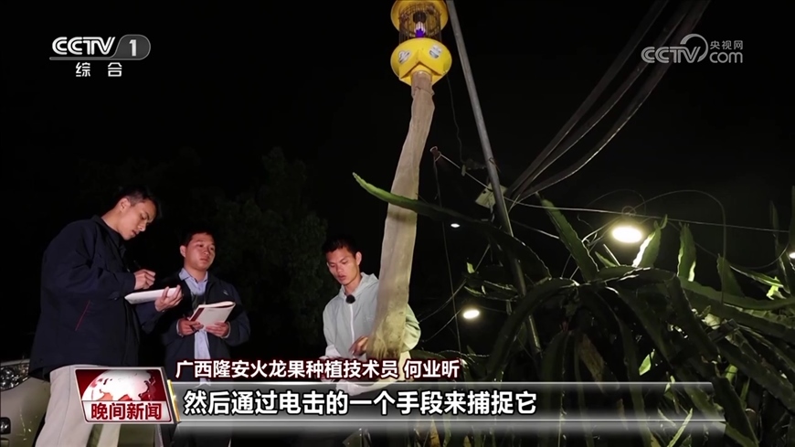 隆安火龍果種植技術(shù)員 何業(yè)昕:這個(gè)燈的話叫做幼蟲燈,主要是通過(guò)一個(gè)燈光發(fā)出了一些光譜來(lái)吸引一些害蟲來(lái),然后通過(guò)電擊的一個(gè)手段來(lái)捕捉它,然后集合到這個(gè)袋子里面。像這種燈的話,我們一般是20到25畝地放一盞,一個(gè)物理防治的手段。