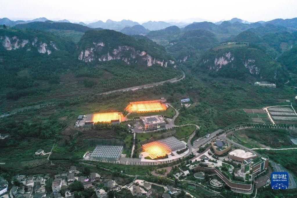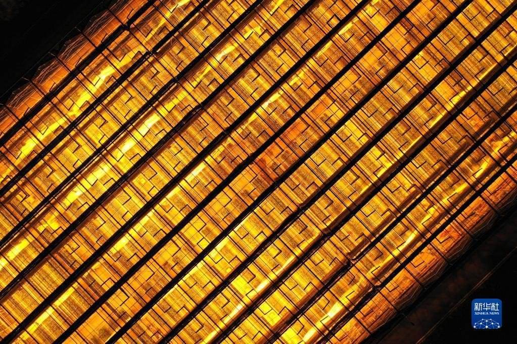 這是5月23日拍攝的貴陽市開陽縣南江蔬菜良種繁育中心育苗大棚夜間補(bǔ)光場(chǎng)景(無人機(jī)照片)。補(bǔ)光更有利于種苗生長(zhǎng),縮短育苗周期。