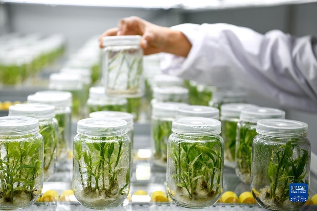 5月23日,工作人員在貴陽市開陽縣南江蔬菜良種繁育中心的組培中心查看小黃姜苗生長(zhǎng)情況。