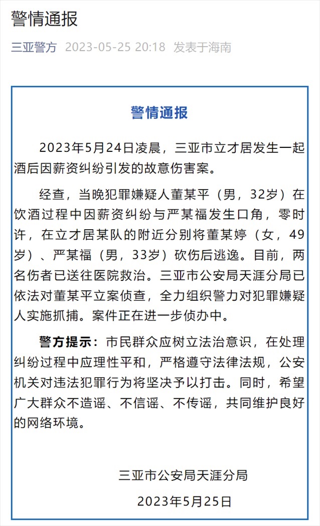 此前,三亞市公安局天涯分局通報稱:5月24日凌晨,三亞市立才居發(fā)生一起酒后因薪資糾紛引發(fā)的故意傷害案。犯罪嫌疑人董某平(男,32歲)在飲酒過程中因薪資糾紛與嚴(yán)某福發(fā)生口角,零時許,在立才居某隊的附近分別將董某婷(女,49歲)、嚴(yán)某福(男,33歲)砍傷后逃逸。