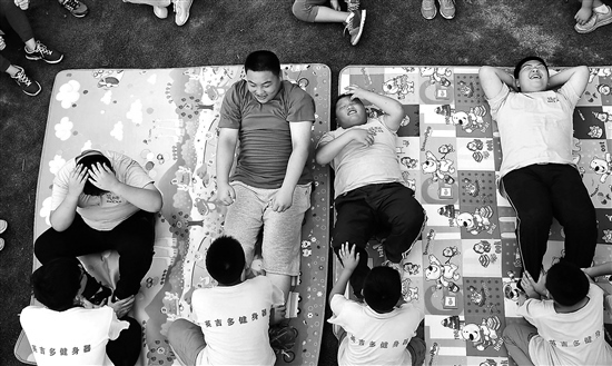 在一個(gè)中小學(xué)超重學(xué)生健康夏令營(yíng)里,孩子們?cè)谧鲅雠P起坐。何海兒 攝/視覺中國(guó)