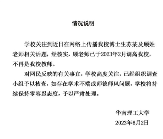 網(wǎng)傳女博士介入導(dǎo)師婚姻,導(dǎo)師帶其發(fā)高水平論文,華南理工大學(xué)、四川大學(xué)啟動(dòng)調(diào)查工作。