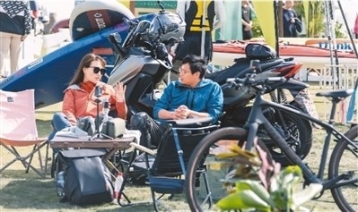 2023淀山湖(昆山)國(guó)際露營(yíng)節(jié)在江蘇省昆山市舉行。露營(yíng)節(jié)涵蓋露營(yíng)裝備展、飛盤活動(dòng)以及露營(yíng)派對(duì)等內(nèi)容,滿足露營(yíng)愛好者的多樣需求。圖為兩名游客在露營(yíng)裝備展區(qū)交流。唐旭騁攝(人民視覺)
