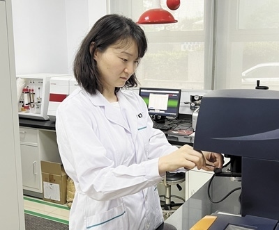 南京市產品質量監(jiān)督檢驗院綠色可降解材料質檢中心副主任朱南幫企業(yè)做測試實驗。蔣若晗攝