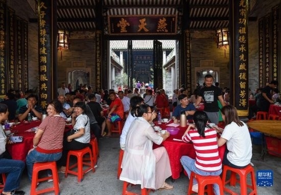 6月15日,2023年車陂龍舟競渡第一名“范陽簡”龍船會在簡氏家祠里擺下幾十桌龍船飯慶祝。
