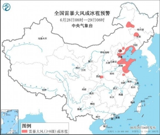 預(yù)計,6月28日08時至29日08時,遼東半島、北京東部、天津北部、河北東北部、山東中東部、四川東部、陜西南部、重慶大部、湖北西部等地部分地區(qū)有大到暴雨,其中,重慶北部局地有大暴雨(100~140毫米)。上述部分地區(qū)伴有短時強降水(最大小時降雨量30~50毫米,局地可超過60毫米),內(nèi)蒙古東北部、黑龍江西南部、吉林中西部、遼寧南部、陜西東南部、河北東部、北京東部、天津、山東北部和東部、安徽北部、江蘇北部等地的部分地區(qū)將有8~10級雷暴大風或冰雹天氣,局地風力可達11級(見圖1和圖2)。中央氣象臺6月28日06時繼續(xù)發(fā)布暴雨藍色預(yù)警和強對流天氣藍色預(yù)警。