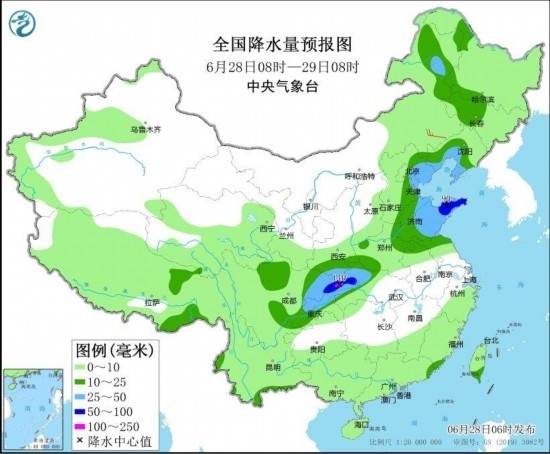 6月28日08時至29日08時,內(nèi)蒙古東北部、東北地區(qū)西部、遼東半島、西北地區(qū)東南部、華北中東部、黃淮東部、江漢西部、川西高原北部、西南地區(qū)東部等地部分地區(qū)有中到大雨,其中,山東半島、湖北西部、四川盆地東北部、重慶北部等地部分地區(qū)有暴雨或大暴雨(100~140毫米)。內(nèi)蒙古東南部部分地區(qū)有4~5級風(見圖3)。