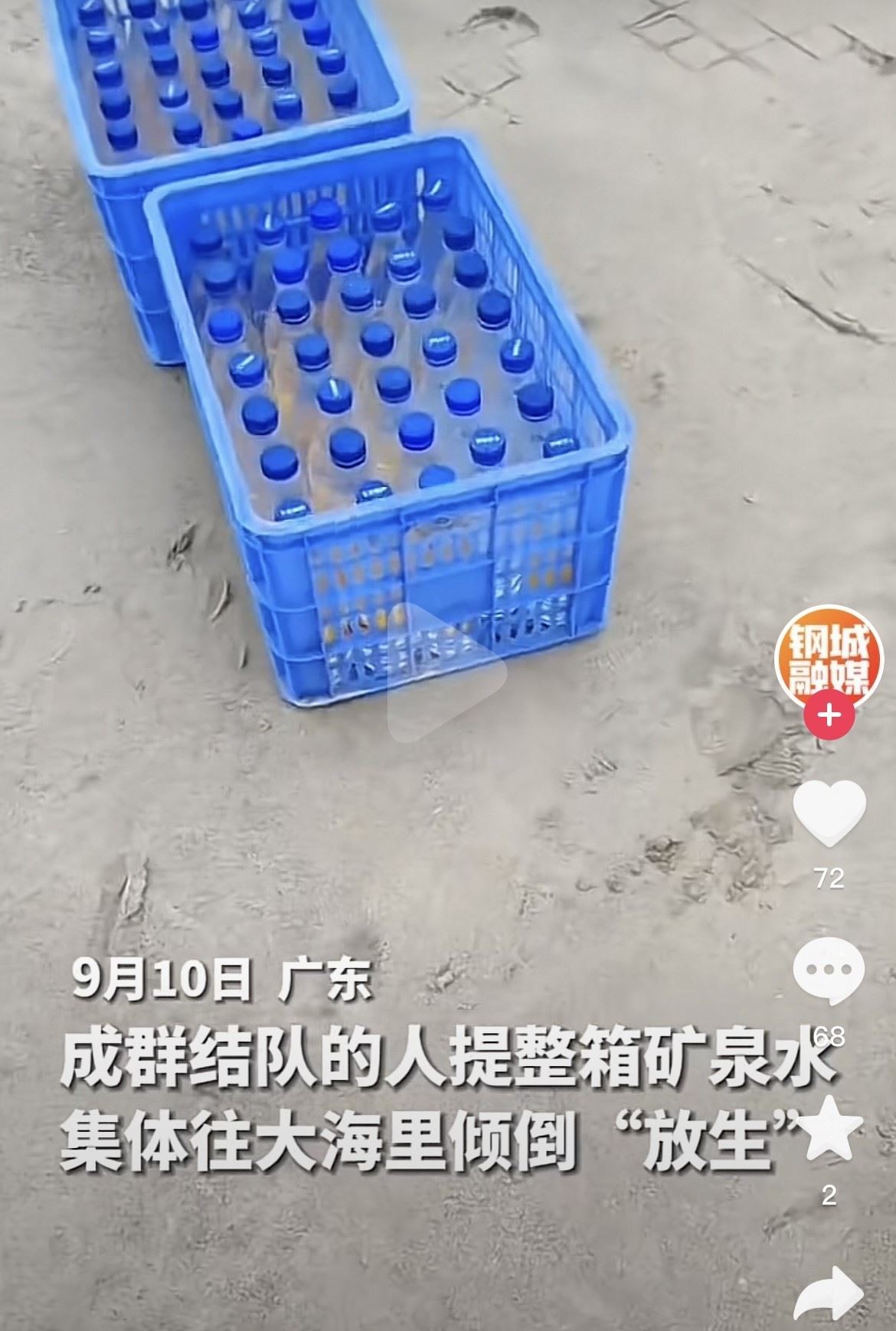 近日,有網(wǎng)友在社交平臺(tái)發(fā)布稱,廣東汕尾湖東港有一群人往海里“放生”礦泉水,60多箱礦泉水被浪費(fèi)。現(xiàn)場(chǎng)視頻顯示,一群人抬著藍(lán)色的箱子正往海邊走,箱子里可見(jiàn)擺放整齊的礦泉水瓶。視頻發(fā)布者介紹,9月10日下午3點(diǎn)多來(lái)了兩輛大巴,大巴上坐滿了人。