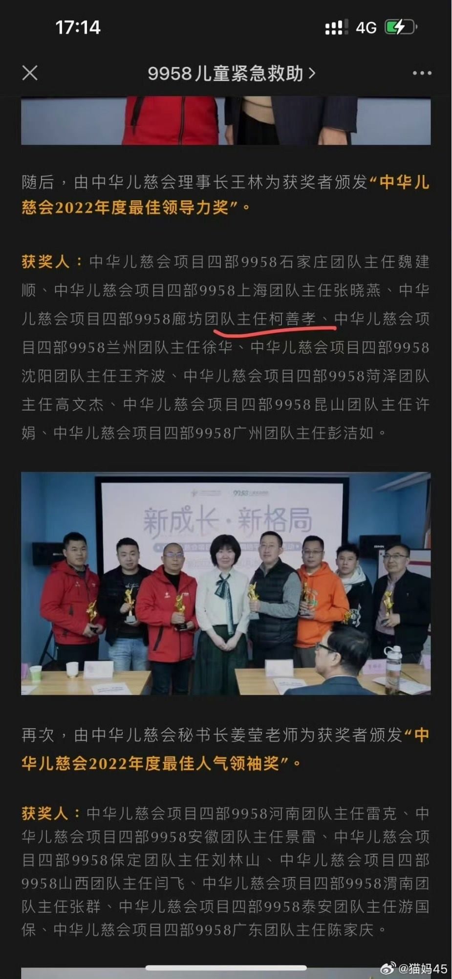 但對這份聲明,被騙家屬們并不認同。首先是涉案人員柯某孝的身份問題,此前中華兒慈會官方公眾號顯示,柯某孝為“中華兒慈會項目四部9958廊坊團隊主任”,獲“中華兒慈會2022年度最佳領導力獎”。目前,中華兒慈會官方公眾號文章已對這些內容進行修改或刪除。