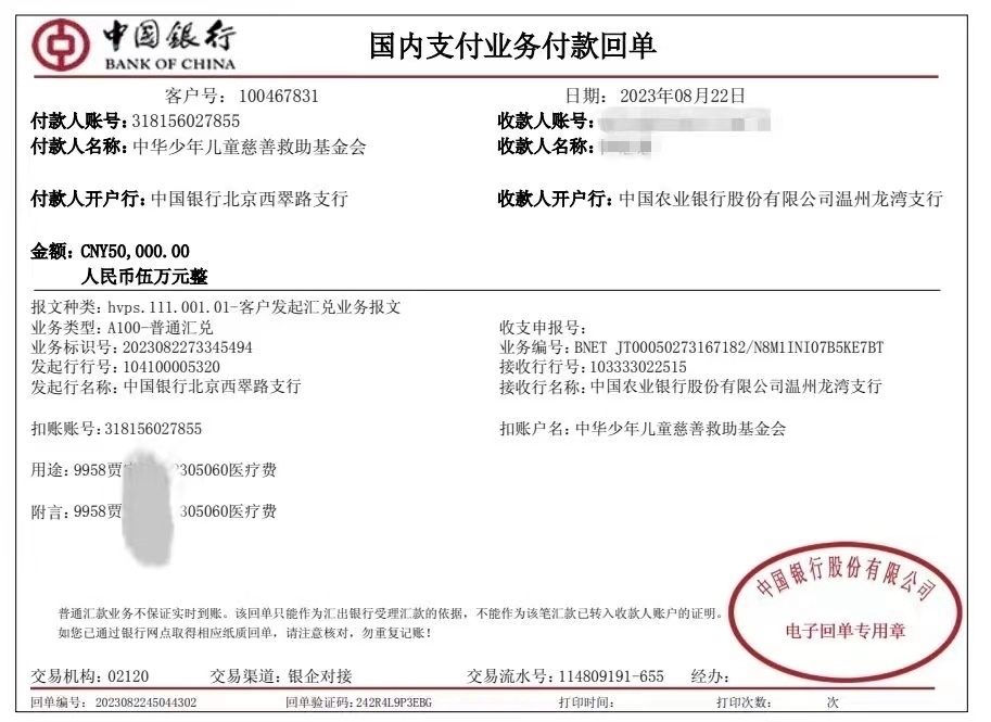 一位患者家屬提供給記者的銀行轉賬記錄顯示,8月22日的一張銀行的付款回單上,付款人名稱為:中華少年兒童慈善救助基金會,收款人名稱為患者家屬陳某某,單據上標注的用途為某某某醫(yī)藥費等字樣。收款金額為5萬元。