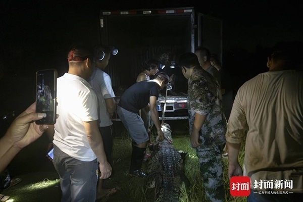 9月16日深夜,封面新聞?dòng)浾邚膹V東茂名茂南區(qū)“出逃”暹羅鱷抓捕現(xiàn)場(chǎng)獲悉,當(dāng)夜有3條暹羅鱷被專(zhuān)業(yè)人員從養(yǎng)殖場(chǎng)外的水域中抓捕上岸。9月11日,茂南區(qū)一鱷魚(yú)養(yǎng)殖場(chǎng)因洪水沖塌圍墻造成部分鱷魚(yú)“出逃”,經(jīng)過(guò)連續(xù)6天的搜尋,截至16日24時(shí),養(yǎng)殖場(chǎng)中原養(yǎng)殖的71條暹羅鱷已有69條被抓獲,僅剩2條仍在搜尋。