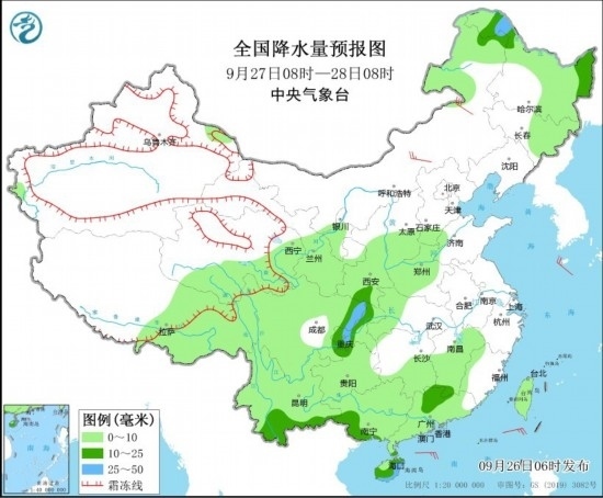 全國降水量預(yù)報圖(9月26日08時-27日08時) 圖片來源:中央氣象臺網(wǎng)站