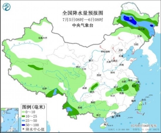 7月5日08時(shí)至6日08時(shí),內(nèi)蒙古東部、黑龍江中南部、吉林北部、云南西部和南部、江西北部、浙江北部等地部分地區(qū)有中到大雨,其中,內(nèi)蒙古東北部、黑龍江西南部等地局地有暴雨(50~80毫米)。內(nèi)蒙古、黑龍江、遼東半島、河北等地部分地區(qū)有4~6級(jí)風(fēng)。