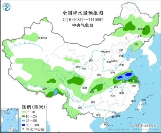 7月6日08時(shí)至7日08時(shí),內(nèi)蒙古東北部、黑龍江南部、吉林北部、西藏東部、川西高原北部、重慶、江淮大部、江南東北部等地部分地區(qū)有中到大雨,其中,河南東南部、蘇皖北部等地部分地區(qū)有暴雨(50~80毫米)。內(nèi)蒙古中部等地部分地區(qū)有4~5級(jí)風(fēng)。