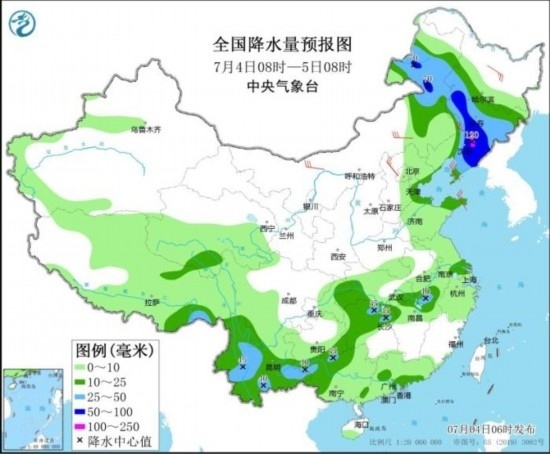 7月4日08時(shí)至5日08時(shí),7月4日08時(shí)至5日08時(shí),內(nèi)蒙古東北部、黑龍江西南部、吉林、遼寧中東部、云南西部和南部等地部分地區(qū)有大到暴雨,其中,遼寧東北部等地局地有大暴雨(100~120毫米)。內(nèi)蒙古、黑龍江、遼寧、河北北部、山東半島等地部分地區(qū)有4~6級(jí)風(fēng)。