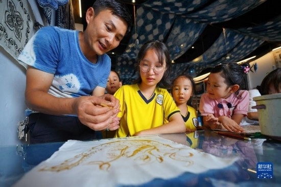 7月12日,在貴州省丹寨縣萬(wàn)達(dá)小鎮(zhèn)一家苗族蠟染非遺體驗(yàn)館,小朋友在非遺傳承人的指導(dǎo)下畫蠟畫。