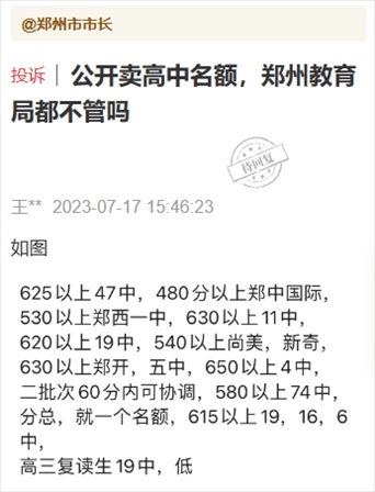 7月16日,有群眾通過頂端新聞“我想@領導”平臺向鄭州市教育局局長留言:“掏錢就能上?鄭州中招販賣名額成風”“公開賣高中名額,鄭州教育局都不管嗎”等類似留言。