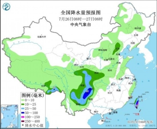 預(yù)計(jì),7月24日08時(shí)至25日08時(shí),四川盆地中南部、重慶大部、貴州北部、云南東北部、湖北西南部、湖南西北部以及浙江南部、福建中北部、江西南部、黑龍江北部、西藏東部等地部分地區(qū)有大到暴雨,其中,重慶南部等地局部地區(qū)有大暴雨(100~140毫米)。上述部分地區(qū)伴有短時(shí)強(qiáng)降水(最大小時(shí)降雨量30~50毫米,局地可超過70毫米),局地有雷暴大風(fēng)等強(qiáng)對(duì)流天氣。中央氣象臺(tái)7月24日06時(shí)繼續(xù)發(fā)布暴雨藍(lán)色預(yù)警。