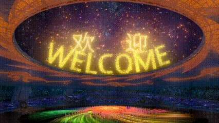 當宣布本屆世界大學生運動會開幕時,空中金色焰火熱烈綻放,隨后空中出現(xiàn)“歡迎”“WELCOME”字樣,隨著大運會火炬塔被點燃,焰火在空中打出成都第31屆世界大學生夏季運動會U形會徽,體育場上空焰火呈現(xiàn)英文“Make Dreams Come True”,命運與共,成就夢想。