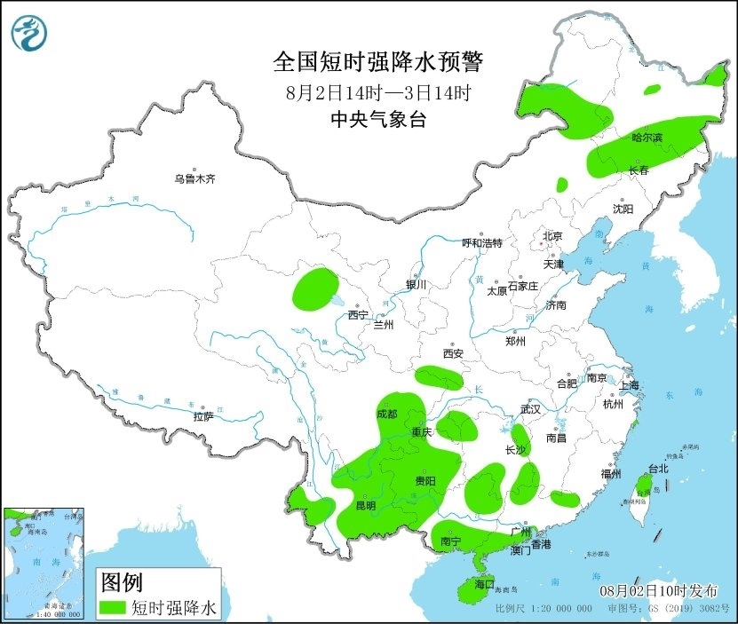 預(yù)計(jì)8月2日14時(shí)至3日14時(shí),內(nèi)蒙古東南部和中部、黑龍江東南部、吉林中西部、遼寧西北部、河北北部、臺(tái)灣島北部等地的部分地區(qū)將有8-10級雷暴大風(fēng)或冰雹天氣;內(nèi)蒙古東部、黑龍江東部和南部、吉林中西部、青海北部、陜西南部、湖南東部和西部、四川東部和南部、重慶西部和東南部、貴州大部、云南東部和西部、廣西南部和西部、廣東北部和西南部、海南島、臺(tái)灣島北部等地的部分地區(qū)將有短時(shí)強(qiáng)降水天氣,小時(shí)雨量30-50毫米,局地可達(dá)60毫米以上。