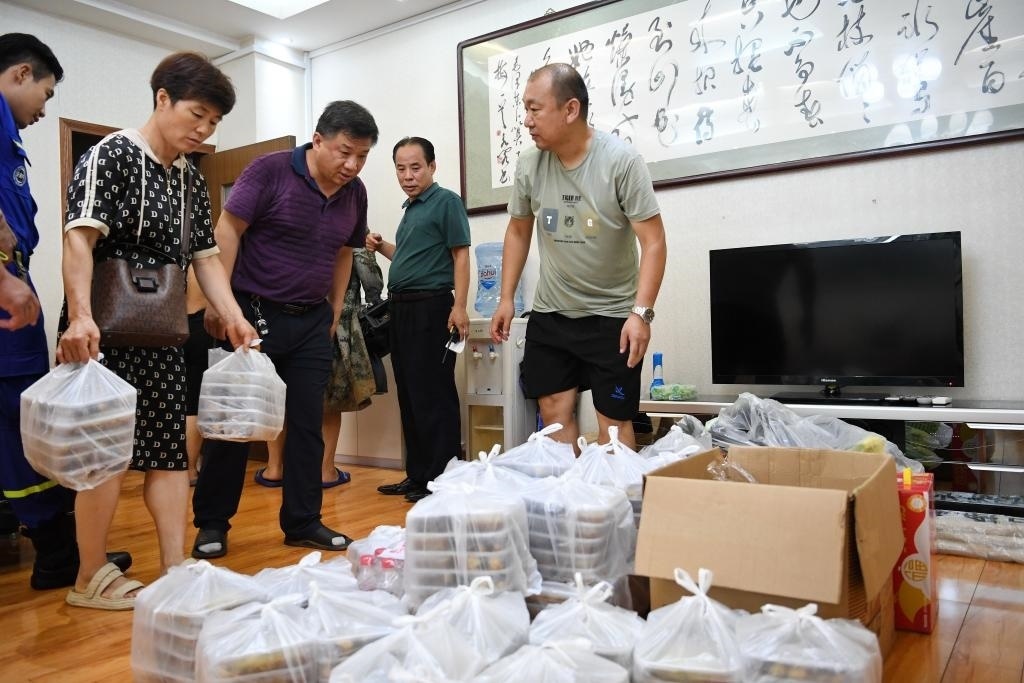 8月1日晚,河北省涿州市職業(yè)技術(shù)教育中心的工作人員正在運(yùn)送飯菜,準(zhǔn)備發(fā)放給安置群眾。新華社記者 牟宇 攝
