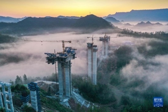 8月4日在湖南省湘西土家族苗族自治州龍山縣拍攝的桑龍高速公路灣檔河特大橋施工現(xiàn)場(無人機照片)。