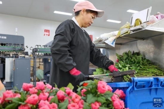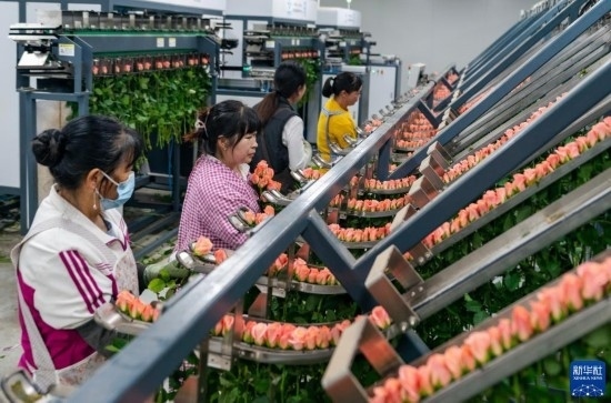 在云天化晉寧花卉產業(yè)現代化示范園內,花農們將預冷處理后的鮮花放入自動分揀流水線(7月12日攝)。新華社記者 崔文 攝