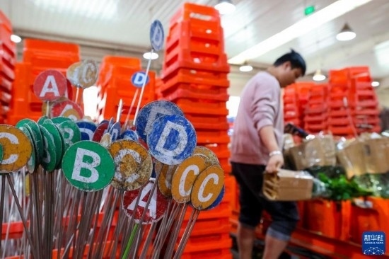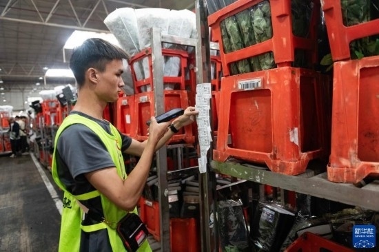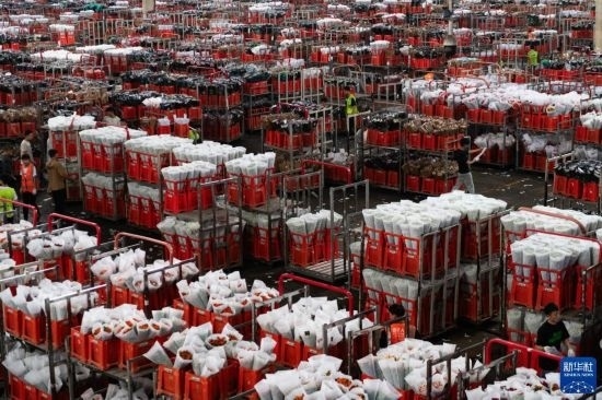 一名工作人員在昆明國際花卉拍賣交易中心內對臺車上存放的鮮花進行掃碼(7月13日攝)。新華社記者 陳欣波 攝