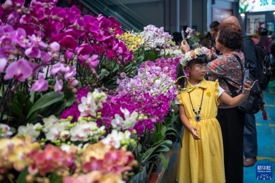 小朋友在昆明斗南花卉市場內的鮮花旁自拍(7月13日攝)。新華社記者 陳欣波 攝