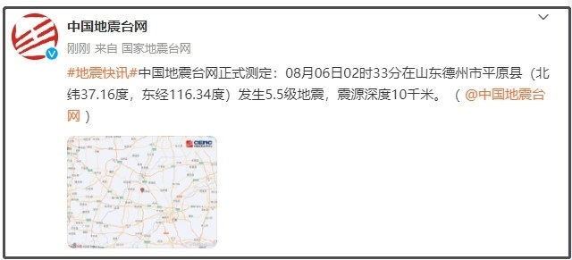 ·山東德州市平原縣發(fā)生5.5級地震,震源深度10公里,河南、河北等地震感強(qiáng)烈。已發(fā)生余震52次,有10人受傷,濟(jì)南啟動三級應(yīng)急響應(yīng)。