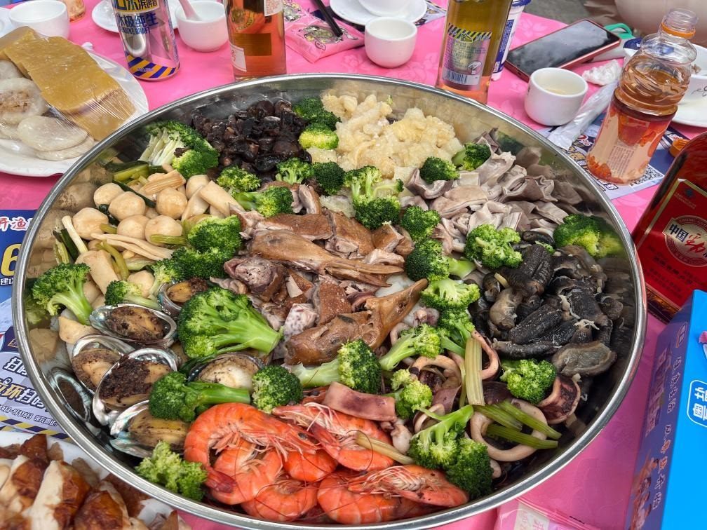 開漁宴上鋪滿海鮮的漁家大盤菜。(陽江廣播電視臺(tái)供圖)