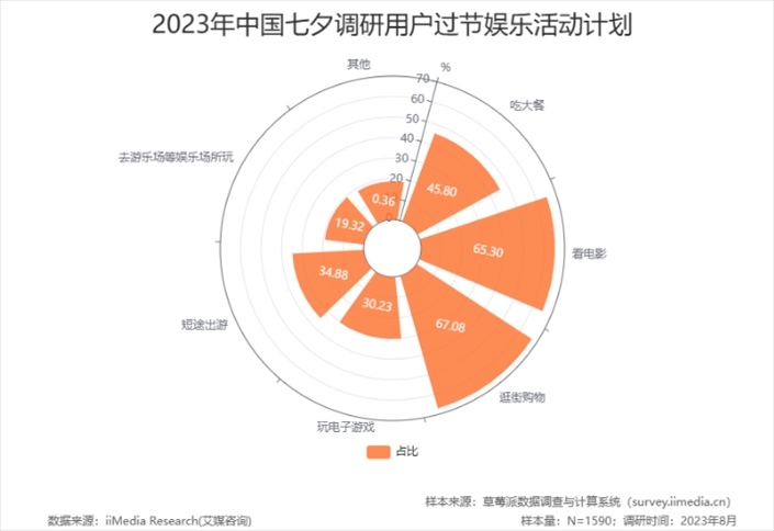 今年七夕恰逢工作日,大多數(shù)人選擇下班后再相聚?!爸袊呦?jié)日消費(fèi)行為大數(shù)據(jù)調(diào)查”顯示,2023年消費(fèi)者過節(jié)的娛樂活動(dòng)計(jì)劃TOP3分別為:逛街購物、看電影、吃大餐。