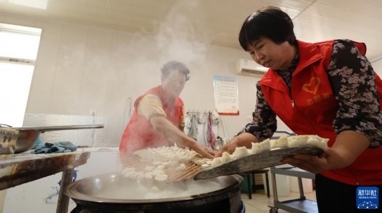 8月22日,青縣金牛鎮(zhèn)大鵓鴿留村孝老食堂的志愿者準(zhǔn)備餐食。